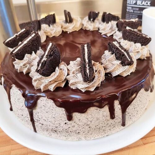£34.50Chocolate sponge layered and covered with Cookies and Cream butter cream. Decorated with a dark chocolate ganache drip, Cookie and Cream buttercream rosettes and half Oreo Cookies.