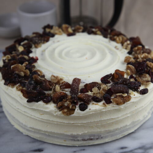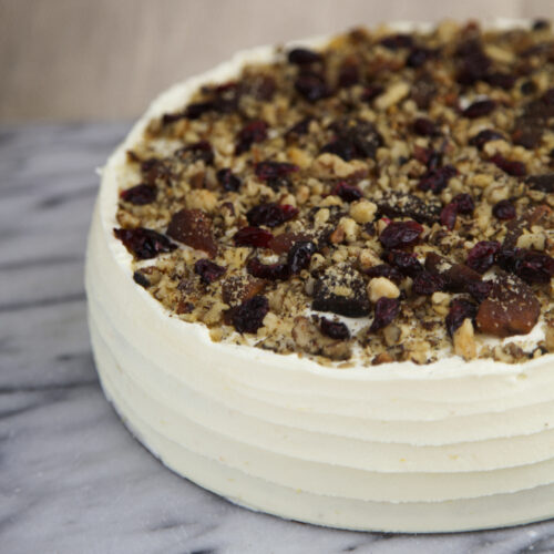 £16.07 – £31.74Moist cake with cinnamon, walnut, & coconut. Decorated with orange butter cream topped with walnuts, cranberries, apricots & pistachio.
